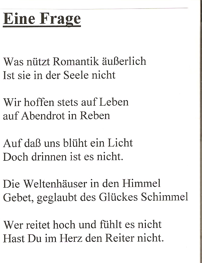 Diese 14 Gedichte habe ich im Jahr 1999 frei aus dem Unterbewusstsein heraus, und ohne eine bestimmte Absicht zu verfolgen, zu Papier gebracht. Der intellektuelle Unterhaltungswert erschließt sich hier nicht. Aber dafür ein tiefes Empfinden ein Seelenmensch zu sein.